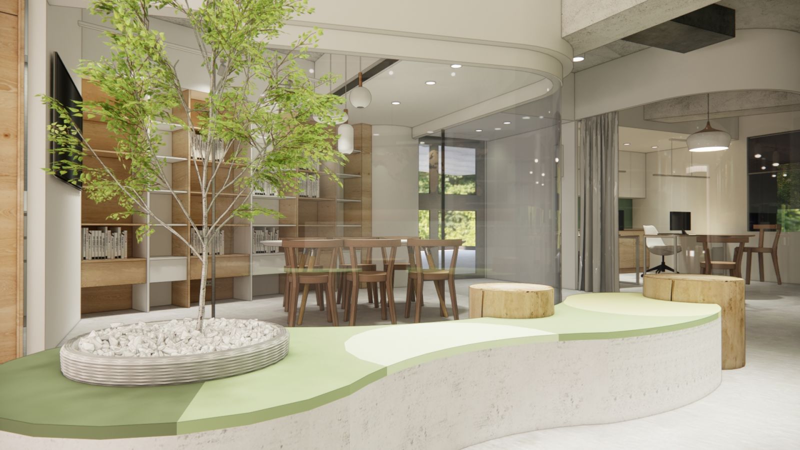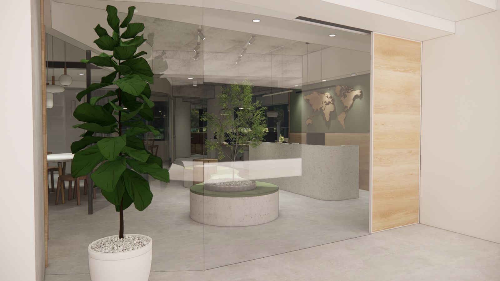 材質與色彩上,以溫潤木質、低彩度綠色與礦物質表面降低建築語彙的張力,回應自然光線在空間中的流動。植栽配置於軸線交會與視覺節點,柔化結構轉折,為日常工作節奏引入停留與呼吸。