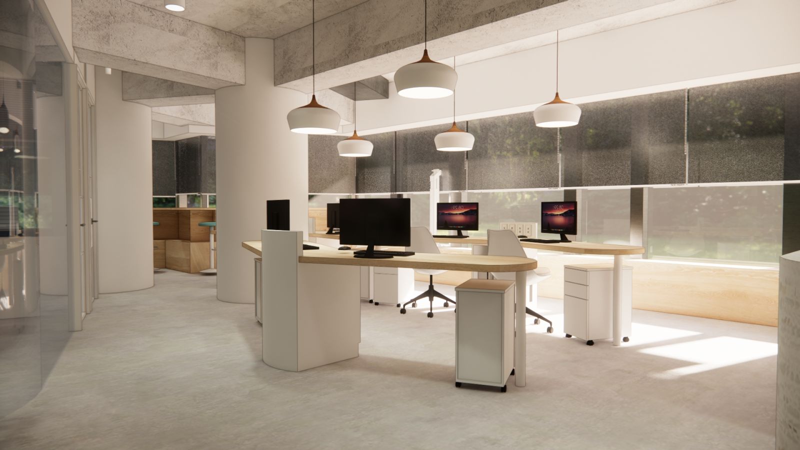 放射結構被轉譯為向心卻不封閉的空間配置,工作、交流與休憩機能依附軸線分布,透過曲線牆面與開放介面的運用,使視線與動線彼此滲透,形成人與人之間保有距離、卻仍能感知彼此存在的關係。