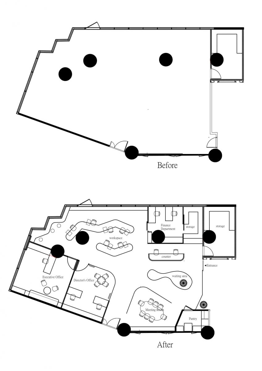 本案以既有建築所形成的放射狀結構為起點,重新解讀其隱含的軸線關係,並將之轉化為空間分割與動線組織的核心。設計不改寫建築原有輪廓,而是順勢梳理不規則量體中的秩序,使空間沿著主軸自然展開,串聯入口、公共區域與各功能場域。