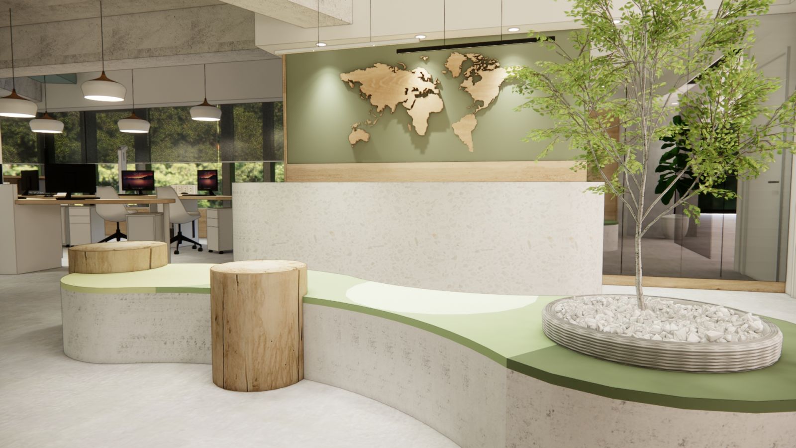 材質與色彩上,以溫潤木質、低彩度綠色與礦物質表面降低建築語彙的張力,回應自然光線在空間中的流動。植栽配置於軸線交會與視覺節點,柔化結構轉折,為日常工作節奏引入停留與呼吸。
