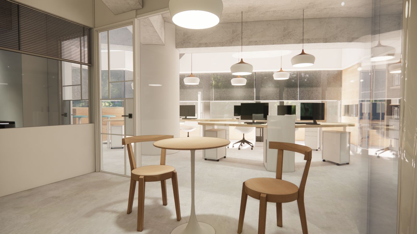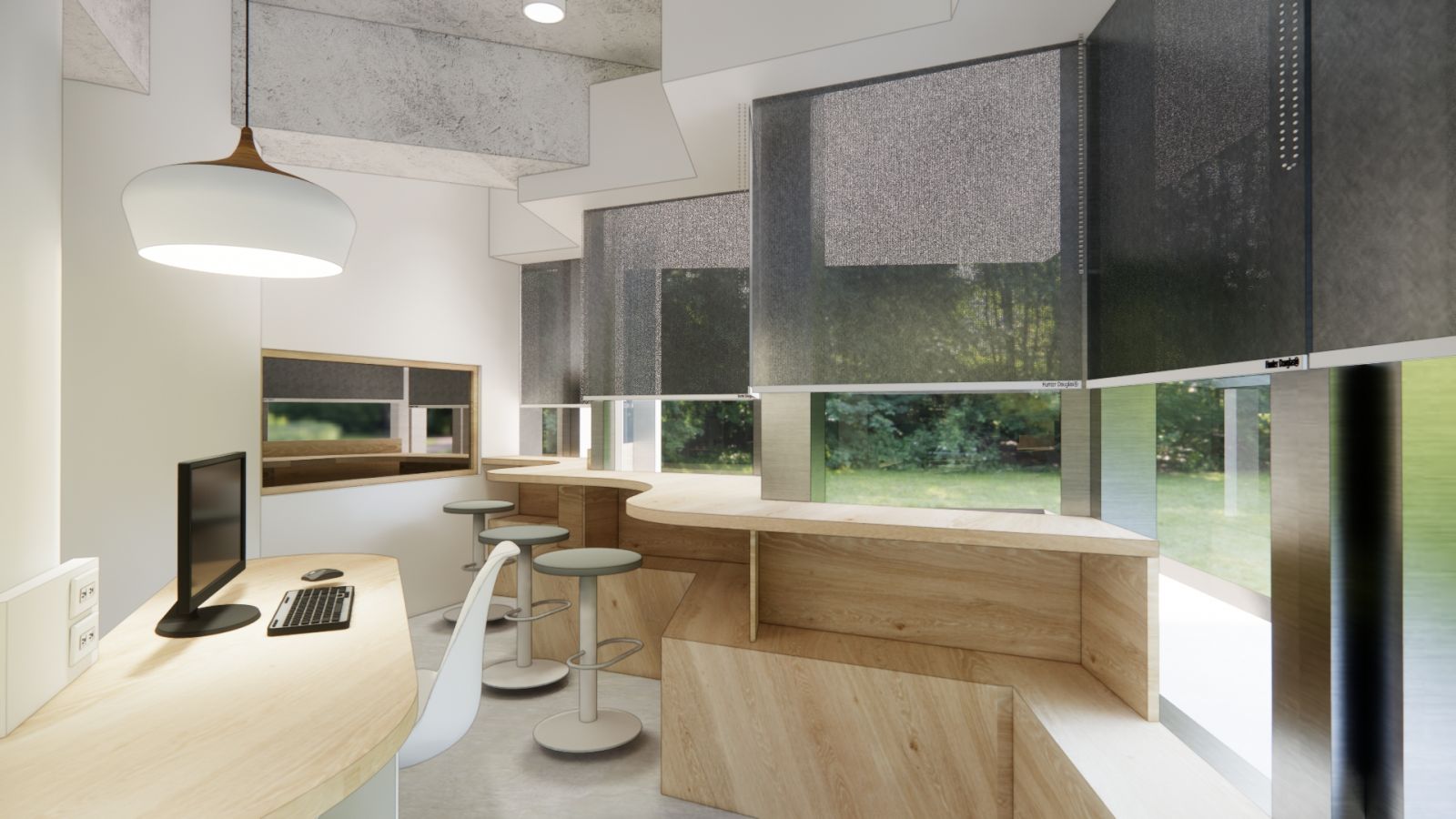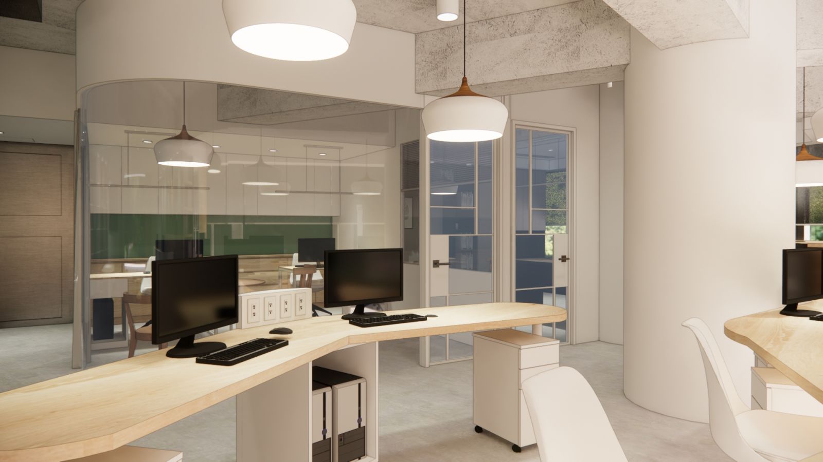 放射結構被轉譯為向心卻不封閉的空間配置,工作、交流與休憩機能依附軸線分布,透過曲線牆面與開放介面的運用,使視線與動線彼此滲透,形成人與人之間保有距離、卻仍能感知彼此存在的關係。