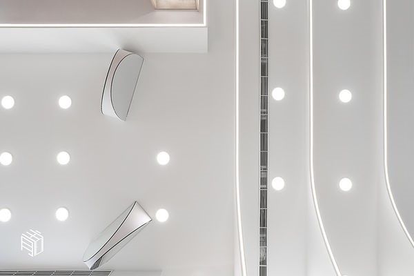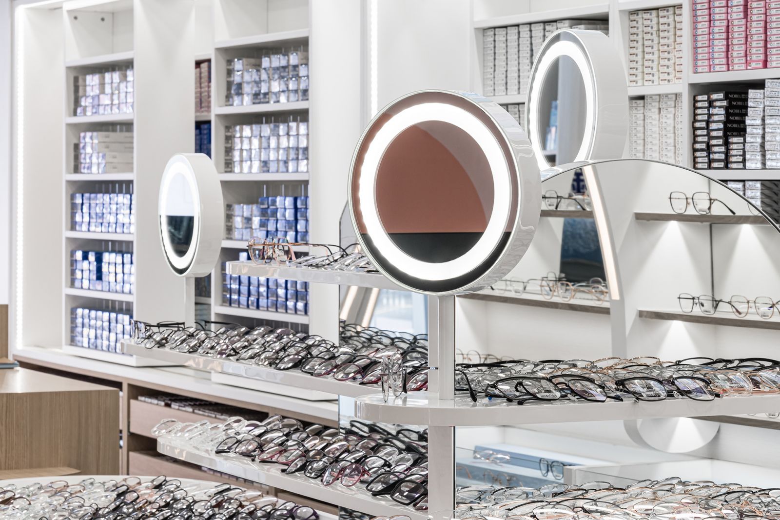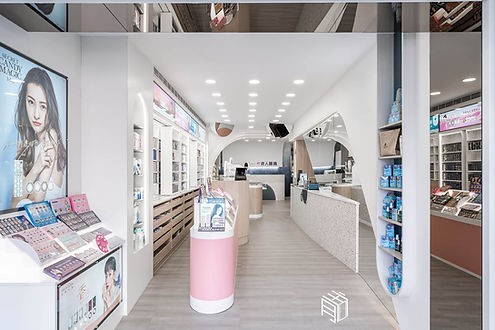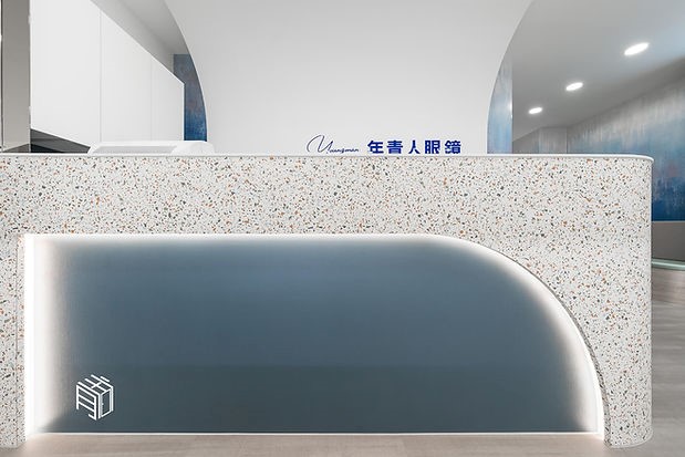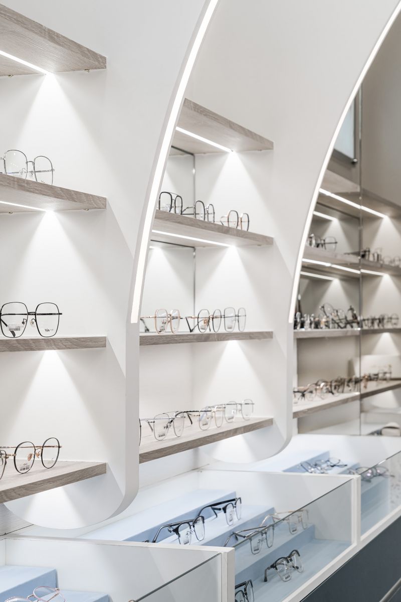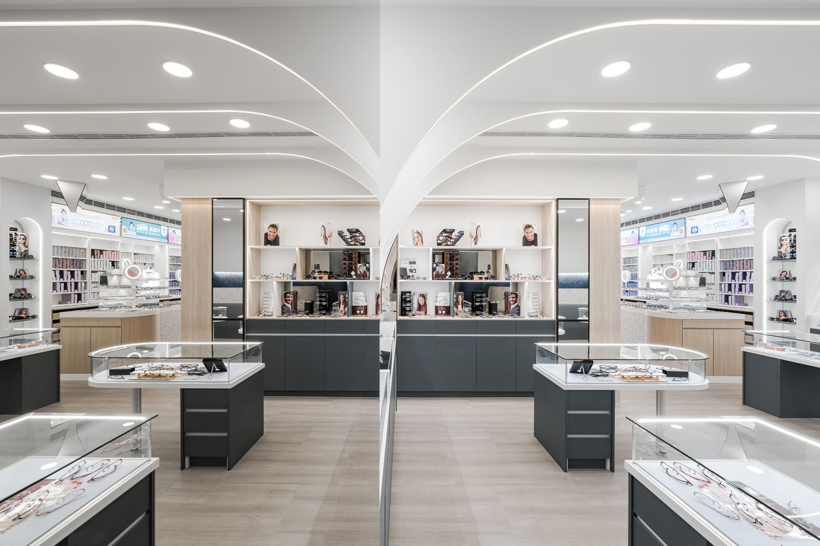 設計再採用大面積的白色,來營造明亮清晰的空間氛圍,解決狹長屋型與單面採光陰暗問題,也運用淺色木紋局部搭配亮色系的粉紅與水磨石來增加視覺亮點,再以銷售行為分割空間分類與強化空間的販售屬性,前區為隱形眼鏡區,主要客群為粉領族的女性,因此設置了類似化妝台的試戴區,強調專業與貼心的服務,後區為主要的眼鏡銷售區,有專業的驗光所與製作眼鏡的工作櫃台,透明化製作眼鏡的過程,在前後兩區的色彩成為景深前後的調和色,讓前區的粉色有著藍色的背景色,也將空間行為分類,空間的天花以大弧形的切割使之景深效果,也讓弧形的線條延伸至眼鏡展示檯面,弧形的線條呼應眼鏡與眼睛的自然弧度,本案也運用了LED燈帶的效果引導動線,讓視覺跟著線條延伸坐落在所有的眼鏡商品。